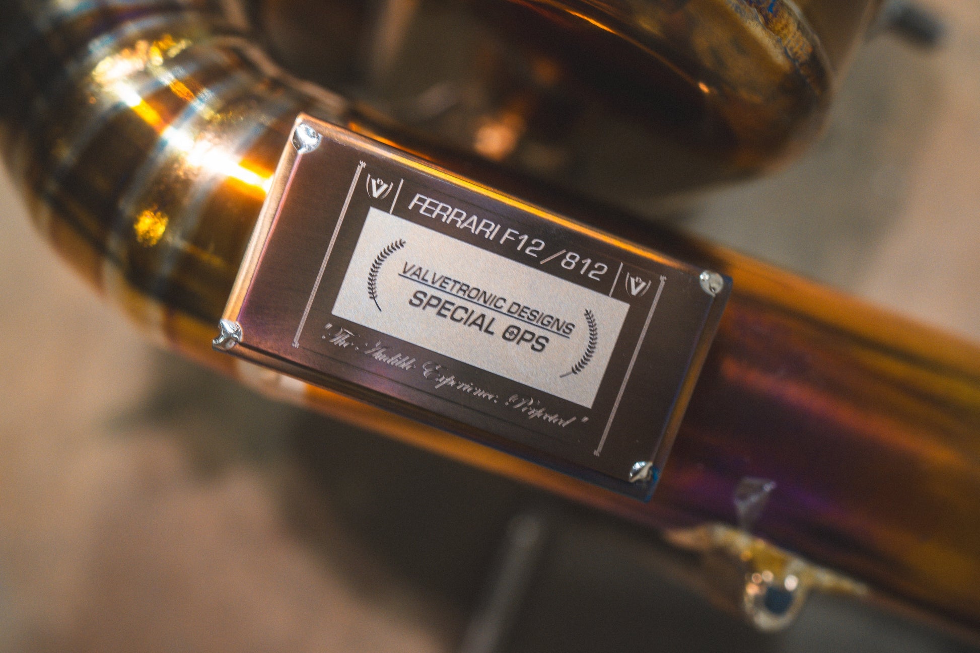 The 6.3 liter Ferrari V 12 reminds us why naturally aspirated is king. Out of the box, the Ferrari F12's exhaust is well optimized. Many companies offer bypass pipes which substantially increase volume, but at Valvetronic Designs we have taken a different approach. We initially designed these muffler bypass units for a customer who wanted a small increase in volume with the valves open, and a more well-rounded exhaust experience, and now we are proud to offer them as part of our special operations program. Featuring vacuum valves, this rear muffler bypass setup gives you raw unaltered sound when open, and when valves closed lessen sound levels and minimize drone to provide an enjoyable cruising experience. The vacuum exhaust valves can be controlled via an external stand-alone system or tied into the car's existing valve solenoid. With valves open volume compared to stock is increased, but our goal was great pitch rather than overall volume. The Ferrari F12 sounds wonderful out of the box but at Valvetronic Designs our muffler bypass system that 6.3 liter V12 extra ability to sing.