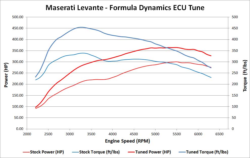 Formula Dynamics has the most Comprehensive Sport Tune available for the Maserati Levante, Levante S / SQ4 / GTS and Trofeo Models. Significant development and testing have gone into our High Power ECU Tune to produce the best results possible for your Maserati helping achieve dramatic increases in Power and Torque while still maintaining excellent drivability and road manners in day to day driving.